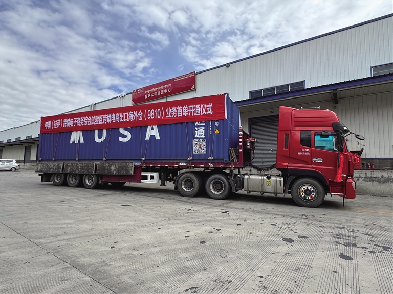陽(yáng)光透過(guò)云層,灑在堆龍德慶區(qū)城投物流園區(qū)寬廣的場(chǎng)地上,兩輛載有藍(lán)色集裝箱的卡車??吭谖锪鱾}(cāng)前,十分引人注目。這是中國(guó)(拉薩)跨境電子商務(wù)綜合試驗(yàn)區(qū)跨境電商出口海外倉(cāng)“9810”業(yè)務(wù)首單,它們將跨越喜馬拉雅山,將滿載的服裝百貨、家用電器等商品送往尼泊爾加德滿都市的海外倉(cāng)。