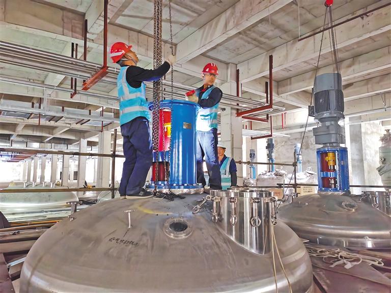 圖為西藏安琪生物科技有限公司工作人員在吊裝生產(chǎn)設備。