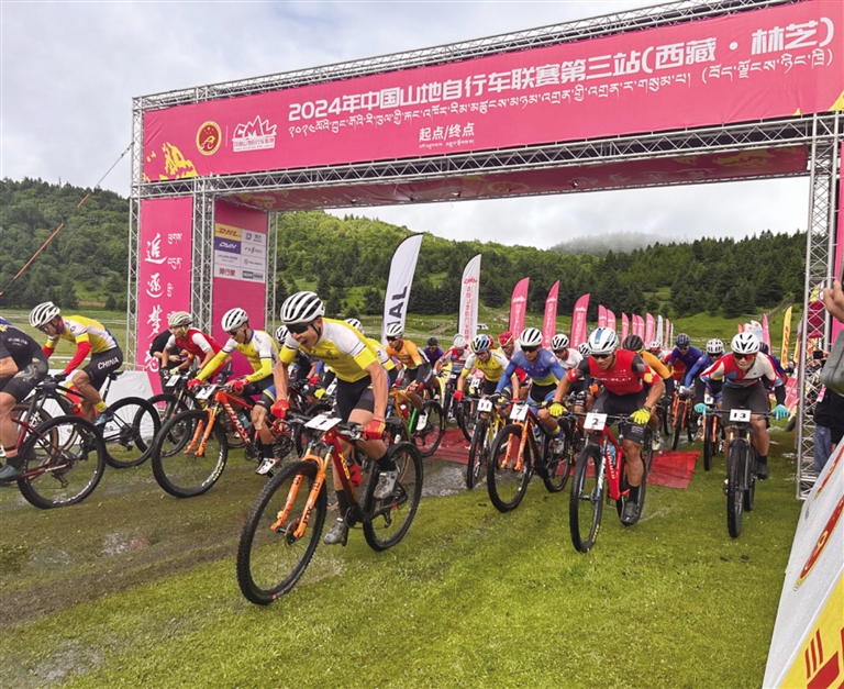 6月29日,2024年中國山地自行車聯(lián)賽第三站(西藏·林芝)在林芝市比日山國家森林公園天邊牧場開賽。來自全國各省、自治區(qū)、市的16支專業(yè)代表隊,以及業(yè)余選手、自行車愛好者們一同角逐競技。