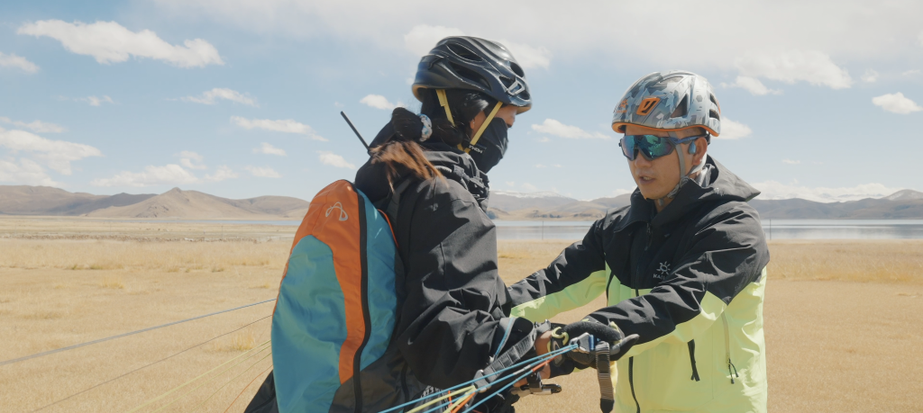 李生濤(右)正在向德吉(左)講解飛傘技巧