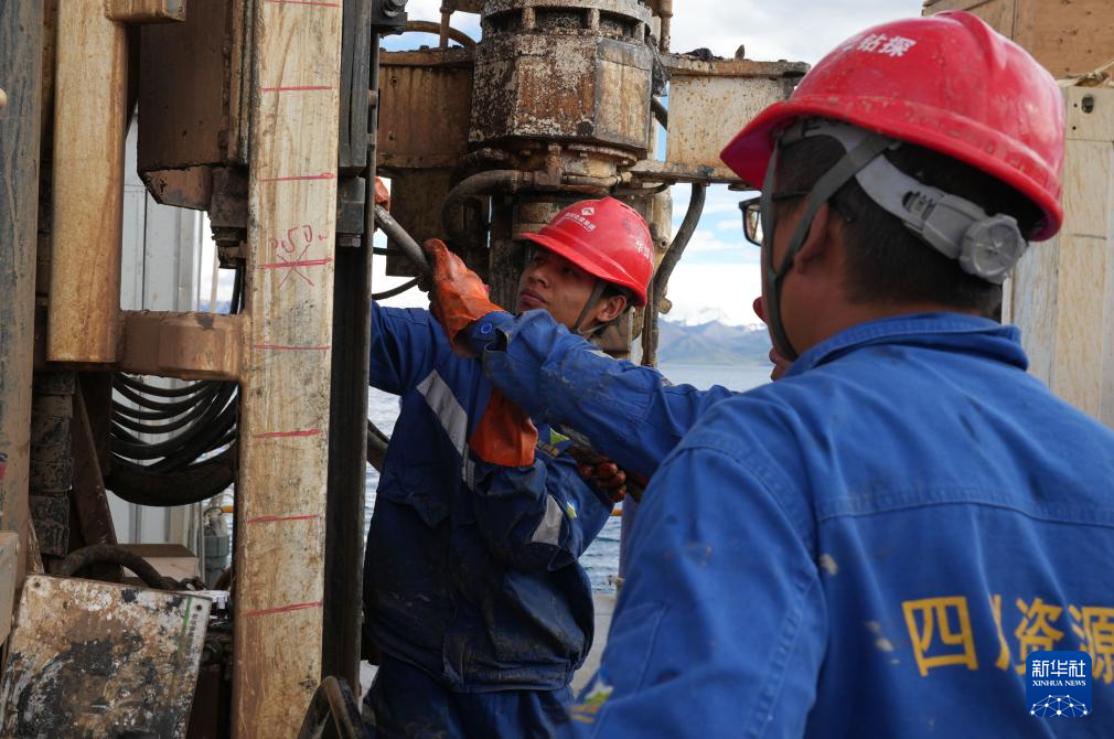 7月12日,鉆探隊員提取納木錯湖底402.2米深度湖泊巖芯樣品。新華社記者 晉美多吉 攝