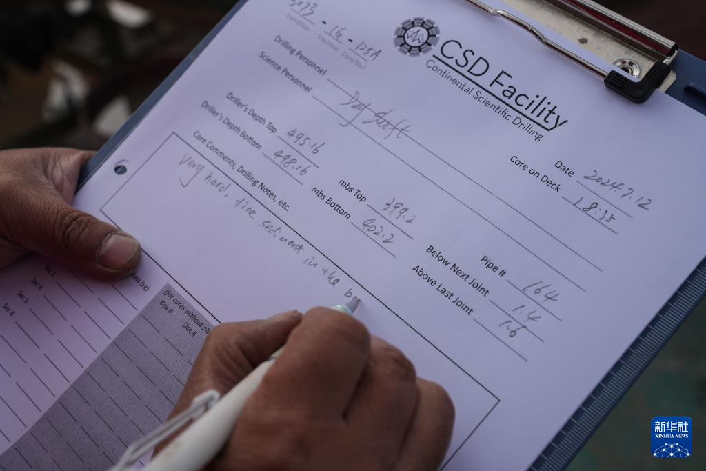 7月12日,科研隊員在登記納木錯湖底402.2米深度湖泊巖芯樣品信息。新華社記者 晉美多吉 攝