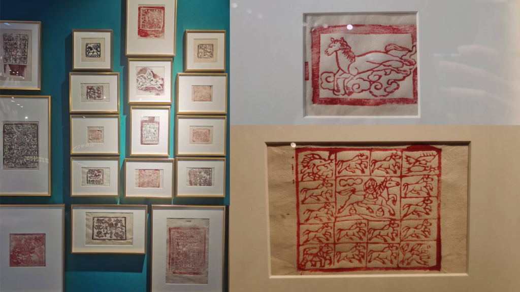 西藏懸掛山間、隨風(fēng)搖曳的成串彩旗,是從古象雄時(shí)期留傳至今的祈福物——風(fēng)馬旗。一組來自西藏各地的17件拓片告訴觀眾:古代的風(fēng)馬旗以雕版拓印而成,其上繪馬,有的肅立、有的飛奔,有的高傲、有的溫馴,種種儀態(tài)不一,還有的和龍鳳虎獅一起嬉戲。