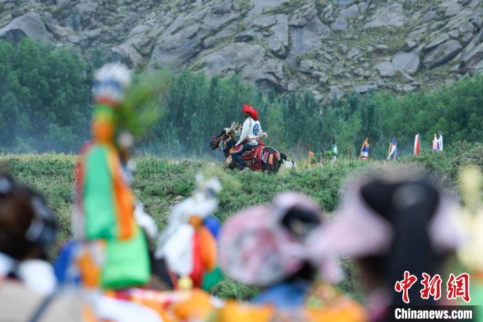 7月24日,西藏拉薩市曲水縣南木村迎來了一年一度的“望果節(jié)”。當(dāng)日,村民們盛裝打扮背上經(jīng)文,圍繞全村田園轉(zhuǎn)上一圈,轉(zhuǎn)到每一塊農(nóng)田前都要煨桑祈求風(fēng)調(diào)雨順、五谷豐登。“望果節(jié)”民俗已有1500多年的歷史,是國家級非物質(zhì)文化遺產(chǎn)。圖為曲水縣南木村村民身著盛裝騎馬繞田。中新社記者 貢嘎來松 攝