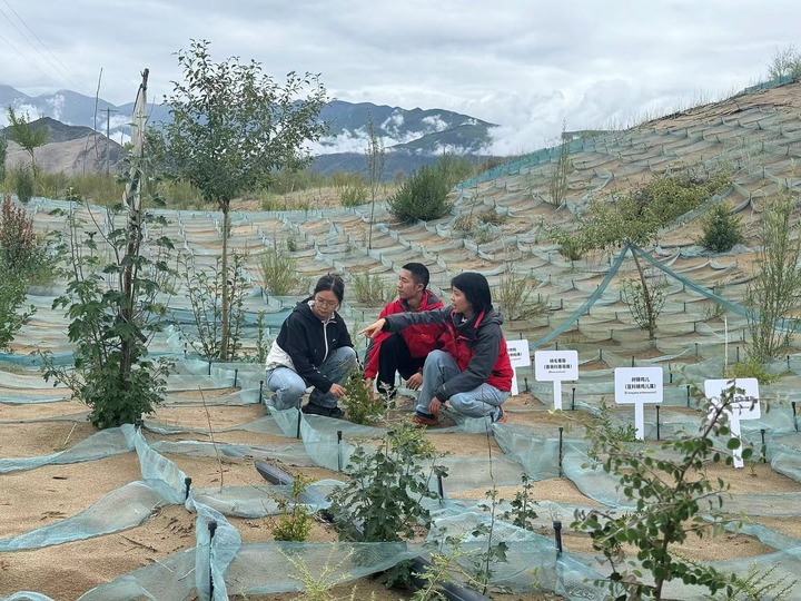 中國科學(xué)院成都山地災(zāi)害與環(huán)境研究所研究員周萍帶領(lǐng)研究生在西藏扎囊縣沙化土地生態(tài)治理綜合示范區(qū)開展沙地試驗(yàn)樣方植被生長狀況監(jiān)測。新華社記者 顧天成 攝