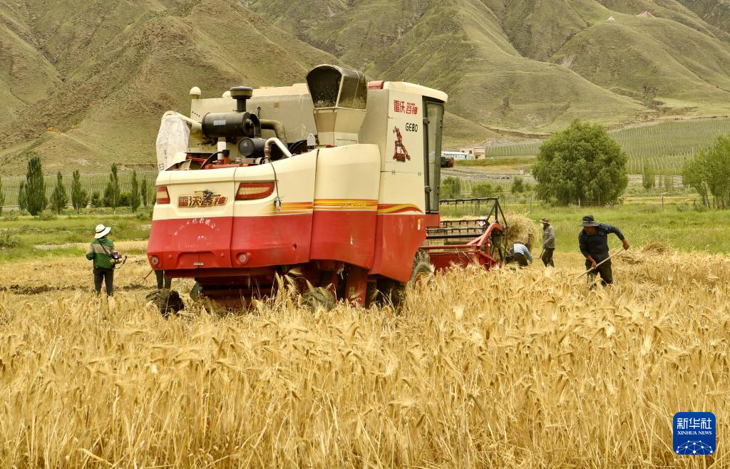 7月31日,聯(lián)合收割機在山南市扎囊縣扎其鄉(xiāng)朗賽嶺村的農(nóng)田里收割青稞。新華社記者 張汝鋒 攝