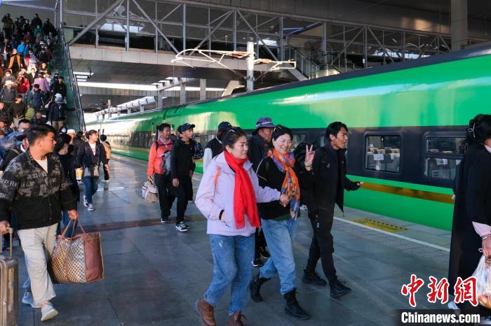 圖為8月16日清晨,乘客在拉薩火車站搭乘C885次列車準備前往日喀則,當日是西藏拉日鐵路通車十周年。中新社記者 江飛波 攝