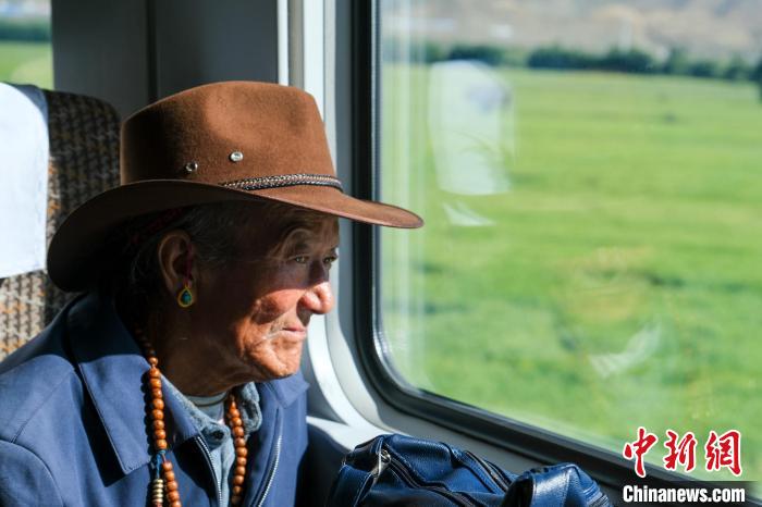 8月16日,71歲的羅布頓珠老人乘坐拉日鐵路C885次列車。中新社記者 江飛波 攝