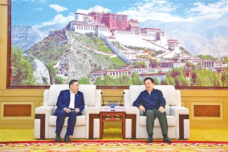 22日上午,自治區(qū)黨委書記王君正在拉薩與中國(guó)能建集團(tuán)董事長(zhǎng)宋海良率隊(duì)的赴藏考察團(tuán)座談。