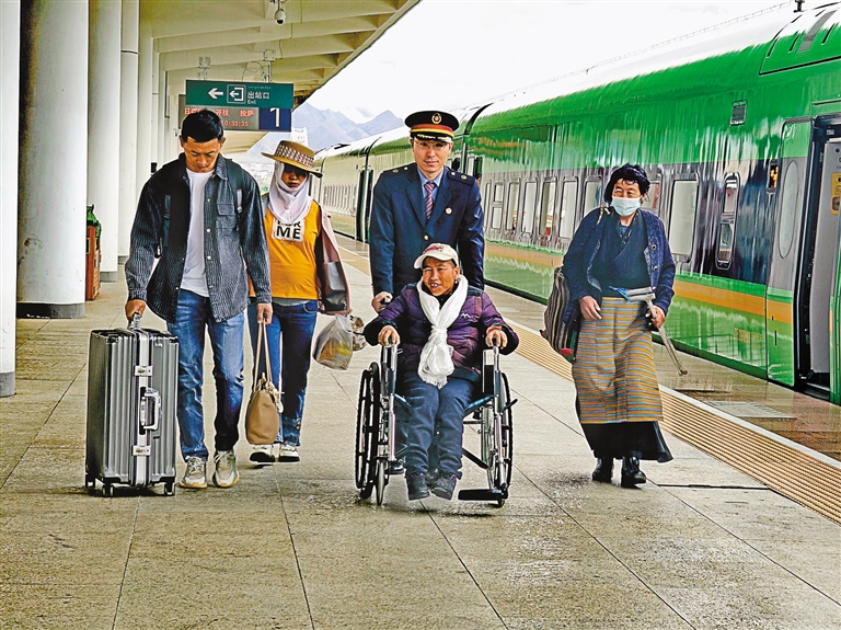 日喀則站“黨員突擊隊”和青年志愿者熱心服務重點旅客。
