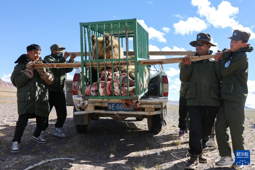 在西藏那曲市尼瑪縣的羌塘國家級自然保護區(qū)核心區(qū),野保隊員將棕熊抬下車(8月30日攝)。新華社記者 劉詩平 攝