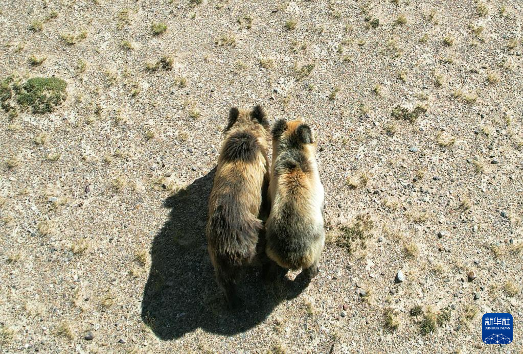 在西藏那曲市尼瑪縣的羌塘國家級自然保護區(qū)核心區(qū),被放歸的棕熊母子走向大自然(無人機照片,8月30日攝)。新華社記者 劉詩平 攝
