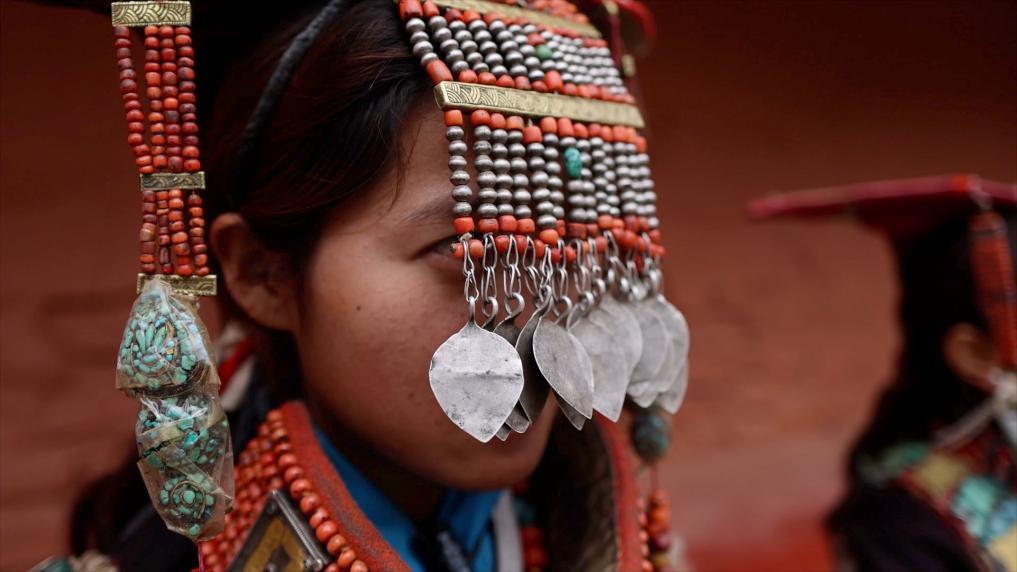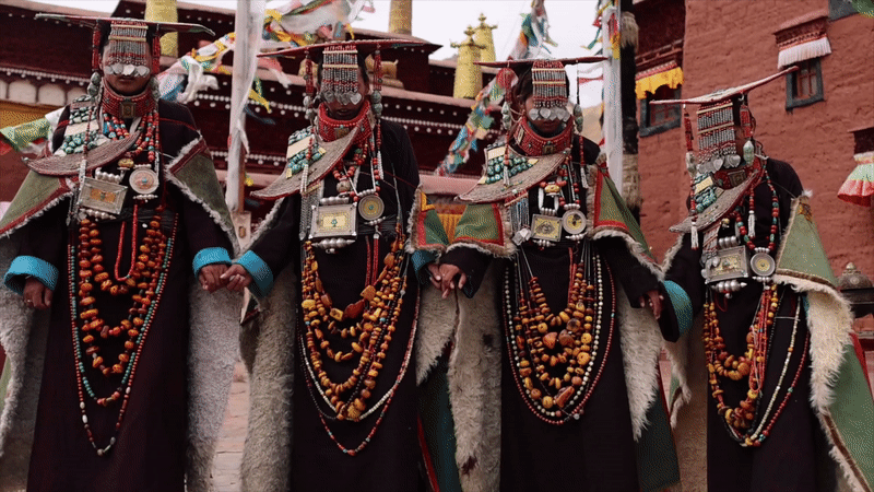 普蘭縣科迦村里有7戶人家保存著7套祖?zhèn)鞣?,一套重達(dá)25公斤,裝飾有黃金、白銀、松石、瑪瑙、珊瑚、珍珠等,承載和沉淀了百年時光,堪稱“穿在身上的千年史”。