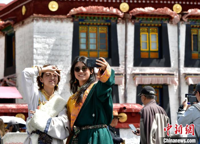 近年來,隨著文化旅游的興起,西藏正快速推進文旅融合。八廓街、布達拉宮廣場等地,身著藏服拍攝寫真也成為眾多游客進藏旅游標配。圖為9月7日游客在八廓街拍攝藏服寫真。中新社記者 李林 攝