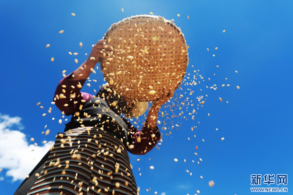 9月19日,村民手持篩子來(lái)回晃動(dòng),黃色的青稞不斷從篩子中掉落下來(lái)。新華網(wǎng)發(fā) 洛克攝