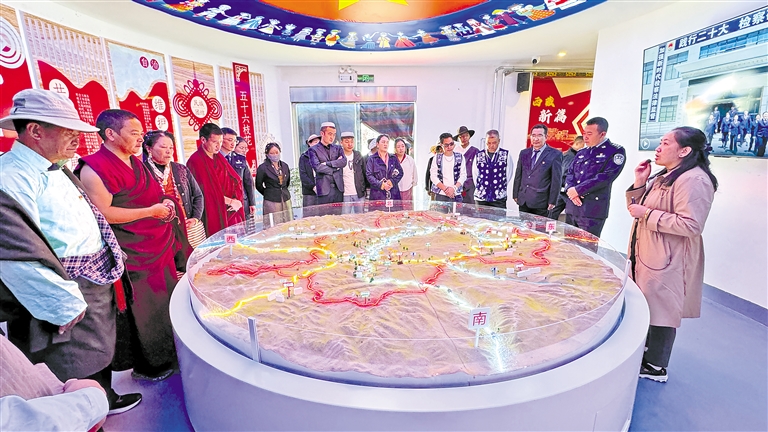 9月14日,拉孜縣曲下鎮(zhèn)以鑄牢中華民族共同體意識(shí)為主線,舉辦首屆“格?;ㄩ_石榴紅·凝心鑄魂新征程”運(yùn)動(dòng)會(huì)暨“迎中秋、慶團(tuán)結(jié)”茶話會(huì)?!D為各民族群眾代表參觀拉孜縣鑄牢中華民族共同體意識(shí)教育館。