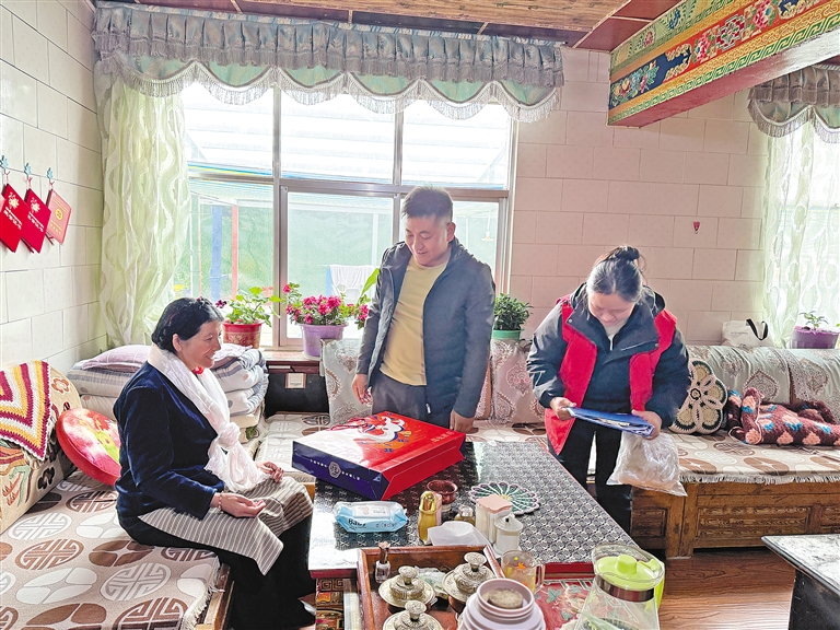 圖為亞?wèn)|縣帕里鎮(zhèn)工作人員在民族團(tuán)結(jié)通婚家庭開展走訪慰問(wèn)。(本版圖片均由記者 扎西頓珠 楊子彥 旦增嘎瓦 攝)