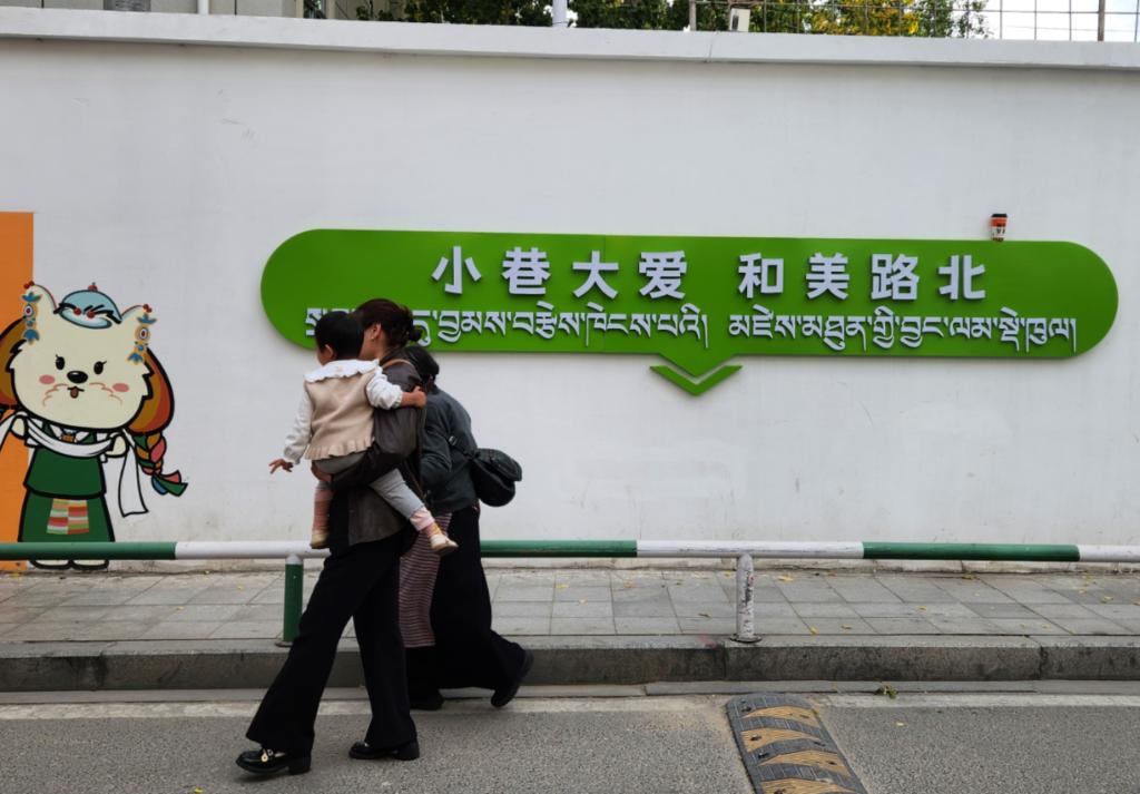 配合路政部門把洽瑪崗路改為單行道,讓街道靜下來;協(xié)同三大運(yùn)營商,把街上縱橫交錯的“飛線”收進(jìn)沿街橋架,還行人一片藍(lán)天;對接專業(yè)設(shè)計(jì)團(tuán)隊(duì),以本地犬種拉薩阿普索犬設(shè)計(jì)社區(qū)IP形象“嘎嘎”(意為快樂),街角的墻繪、樹上的引導(dǎo)牌、商戶的門臉上都能看到這只可愛的小狗……社工旦增晉美對社區(qū)的變化如數(shù)家珍。