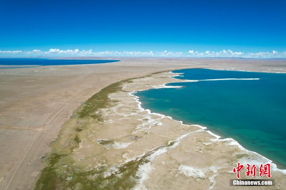 國慶期間,中新網(wǎng)記者自駕西藏藏北羌塘草原,途經(jīng)“天湖”納木錯(cuò),高原鹽湖班戈湖以及西藏第一大湖色林錯(cuò)等地。秋天高原藍(lán)天白云的映襯下,藏北湖泊猶如一面面巨大的“寶石藍(lán)”鏡子鑲嵌于高原大地,景色壯麗。圖為10月2日,西藏班戈縣班戈湖,畫面左上角為色林錯(cuò)。記者 江飛波 攝