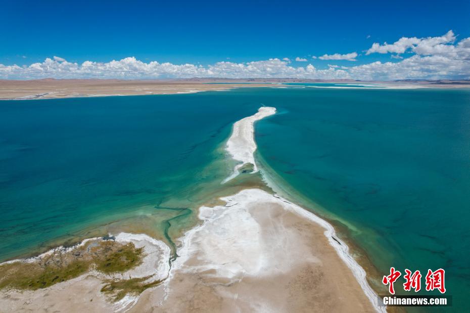 國慶期間,中新網(wǎng)記者自駕西藏藏北羌塘草原,途經(jīng)“天湖”納木錯(cuò),高原鹽湖班戈湖以及西藏第一大湖色林錯(cuò)等地。秋天高原藍(lán)天白云的映襯下,藏北湖泊猶如一面面巨大的“寶石藍(lán)”鏡子鑲嵌于高原大地,景色壯麗。圖為10月4日,航拍西藏色林錯(cuò)水天相接。記者 江飛波 攝
