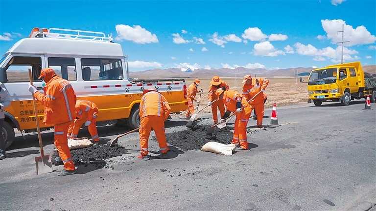 “我們養(yǎng)護(hù)的這段公路,每年只有兩個(gè)季節(jié),冬季和夏季。冬季漫長(zhǎng),主要的工作是鏟雪保通;夏季短暫,主要就是不斷填坑鋪油?!钡馗赂嬖V記者,青藏公路長(zhǎng)期承擔(dān)著進(jìn)出藏物資運(yùn)輸重任,每天進(jìn)出藏車(chē)流量大。養(yǎng)護(hù)保通工作雖然單調(diào),但大家都明白這份工作的重要性。