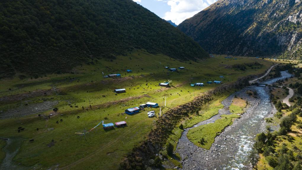 貢喬熱旦家夏季牧場的全貌(無人機(jī)照片,9月4日攝)。新華社記者 丁增尼達(dá) 攝