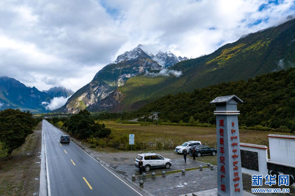 10月11日拍攝的波密通車紀念廣場(無人機照片)。2020年,西藏波密縣通過查閱文獻史料、比對老照片、咨詢當(dāng)?shù)乩先?、遠程連線老一輩同志等方式,考證出當(dāng)時舉行通車典禮的地點為今波密縣松宗鎮(zhèn)角達村國道318旁。為紀念這一歷史事件,2021年4月波密縣在此處修建了波密通車紀念廣場。新華網(wǎng) 旦增努布 攝