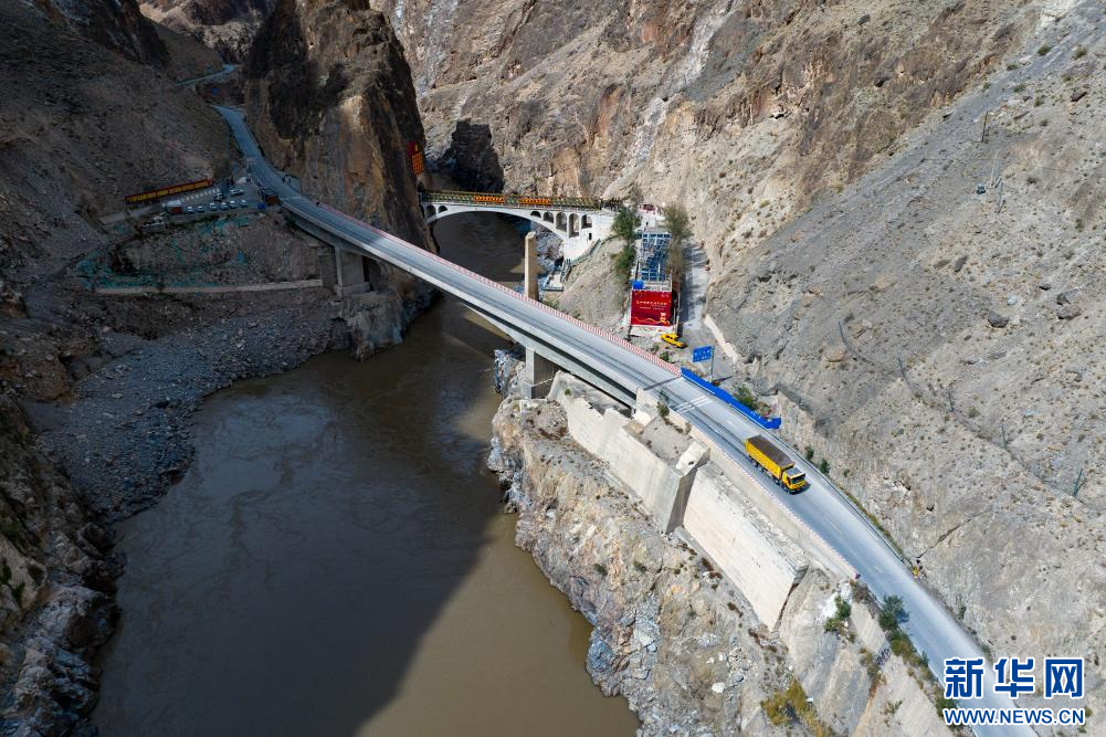 俯瞰通麥路段上的三座建于不同時期的橋(10月10日攝 無人機照片)。位于西藏林芝市波密縣境內(nèi)的川藏公路通麥路段,曾被稱為“通麥天險”。新華網(wǎng) 旦增努布 攝