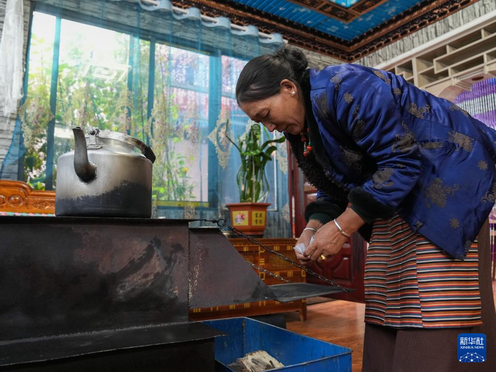 紐林塘村村民格桑卓瑪在家中為客人沏茶(10月14日攝)。新華社記者 丁汀 攝