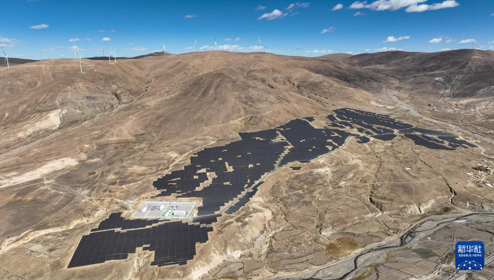10月17日拍攝的位于西藏日喀則市薩迦縣的中核薩迦300兆瓦風(fēng)光儲(chǔ)一體化電站(無人機(jī)照片)。新華社記者 晉美多吉 攝