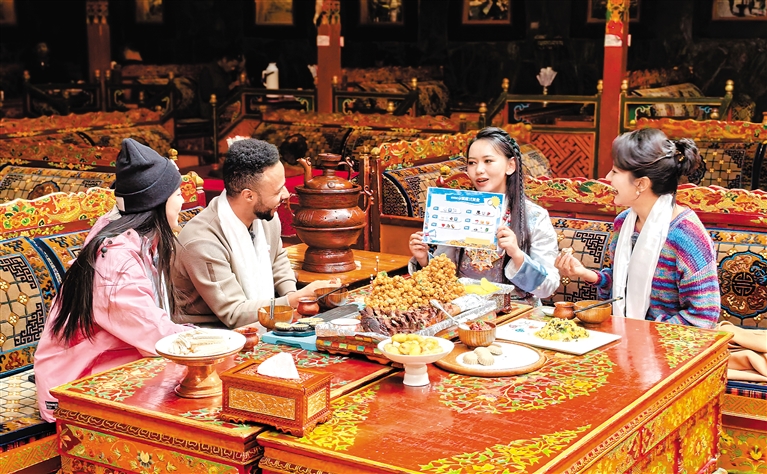 “在我們餐廳,經(jīng)常能看到不同民族、不同地方的人們同吃一道菜、共飲一壺茶的場景,大家其樂融融,就像一家人一樣?!辈惋嫹?wù)人員益西說。