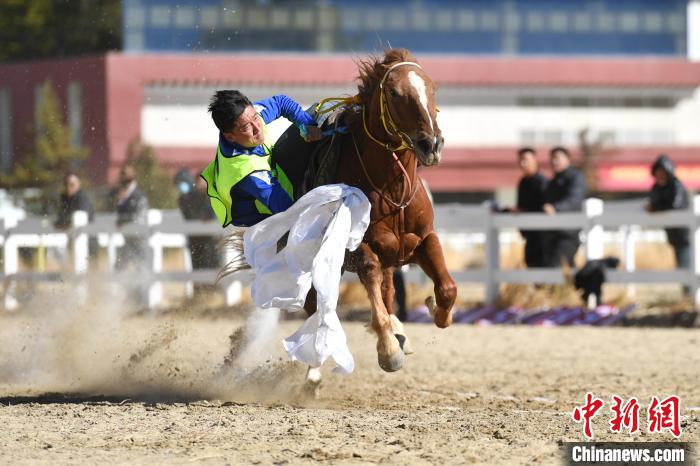 27日,由西藏自治區(qū)體育局、西藏自治區(qū)體育總會主辦,西藏自治區(qū)社會和民族傳統(tǒng)體育指導(dǎo)管理中心承辦的2024年西藏自治區(qū)青少年民族傳統(tǒng)馬術(shù)比賽在拉薩市北郊賽馬場舉行。本次比賽共有30余名運動員,40余匹馬參賽,比賽共設(shè)民族賽馬和傳統(tǒng)馬術(shù)2個大項5個小項。圖為西藏青少年民族傳統(tǒng)馬術(shù)比賽現(xiàn)場。中新社記者 貢嘎來松 攝