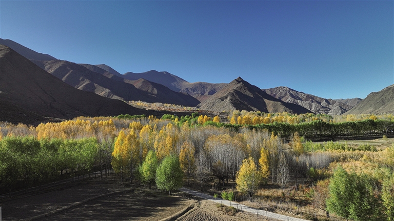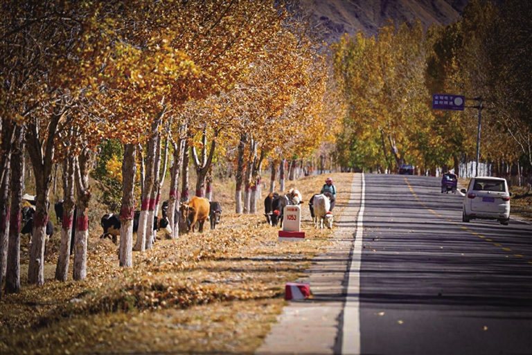 G318被稱為“中國景觀大道”,沿途壯麗絕美的風(fēng)光令人心醉神迷。恰風(fēng)和日麗的一天,記者一行驅(qū)車前往G318曲水段與達孜段。一路層林盡染,落葉飄飛,如詩如畫,美不勝收。