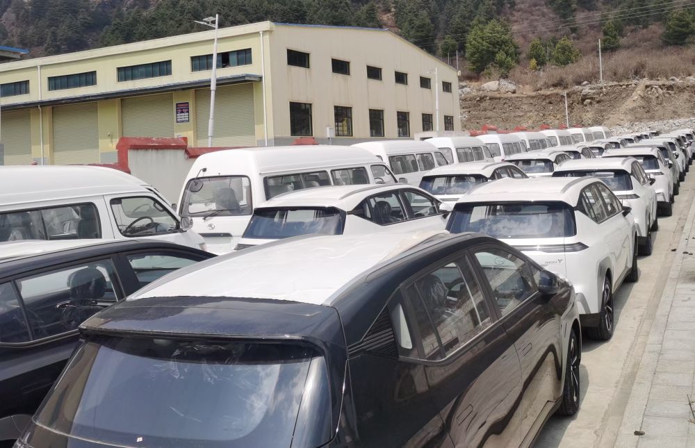 在日喀則市吉隆邊境經(jīng)濟(jì)合作區(qū),一批新能源汽車(chē)等待出口。新華社記者魏冠宇 攝