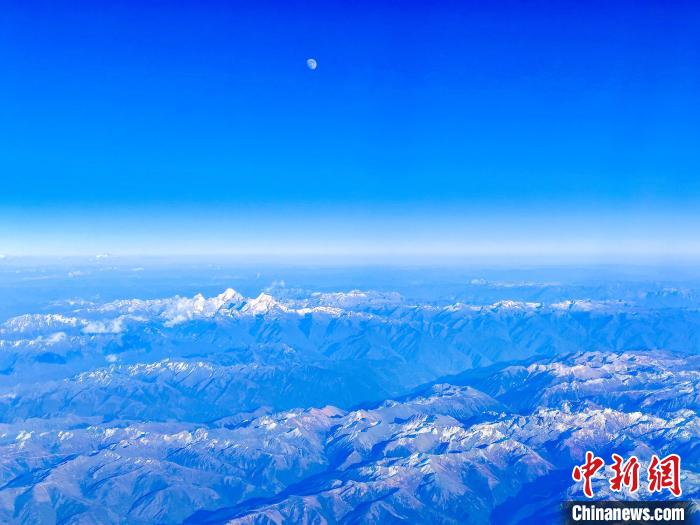 近日,中新網(wǎng)記者從云南昆明長(zhǎng)水國(guó)際機(jī)場(chǎng)乘機(jī)前往西藏自治區(qū)拉薩市,飛機(jī)穿過(guò)橫斷山脈,抵達(dá)雪域高原。望向窗外,沿途依次看到了玉龍雪山、南迦巴瓦雪山以及遠(yuǎn)遠(yuǎn)的念青唐古拉雪山等,還有很多小新也不知道名字的雪山,可謂實(shí)現(xiàn)了“雪山自由”。圖為11月13日,從飛機(jī)上拍到的月亮與玉龍雪山(右下方)。記者 江飛波 攝