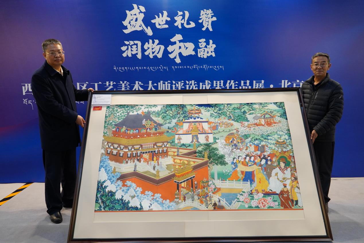 “西藏自治區(qū)工藝美術(shù)大師評選成果作品展”由西藏自治區(qū)經(jīng)濟和信息化廳、西藏自治區(qū)民族事務(wù)委員會聯(lián)合主辦,于2024年11月7日在民族文化宮展出。本次捐贈作品為“西藏自治區(qū)工藝美術(shù)大師評選成果作品展”中的5件代表性精品力作,包括唐卡作品《格薩爾王》(復(fù)制件)(作者:貢覺杰)、《文成公主建小昭寺》(復(fù)制件)(作者:羅布斯達)、《一枝一葉總關(guān)情》(復(fù)制件)(作者:珠木巧),堆繡作品《金絲野牦?!罚ㄗ髡?晉美洛追)、《石榴籽》(作者:晉美洛追)。任毅同志向作者頒發(fā)了收藏證書,并表示誠摯感謝。