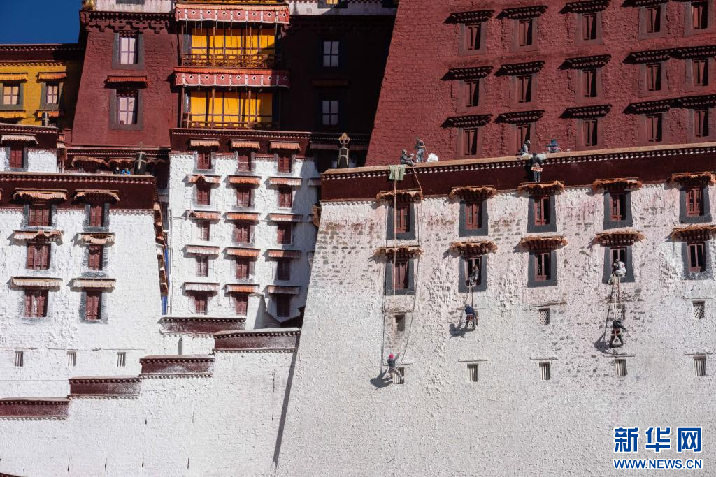 10月30日,布達(dá)拉宮管理處工作人員開(kāi)展例行“潑甜墻”,對(duì)外墻進(jìn)行粉刷。新華社記者旦增尼瑪曲珠 攝