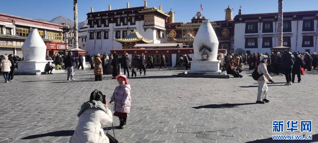 11月29日,游客在西藏拉薩大昭寺前留念,其身后的煨桑爐設(shè)有煙筒和鋼制攔火門(mén)。新華社記者魏冠宇 攝