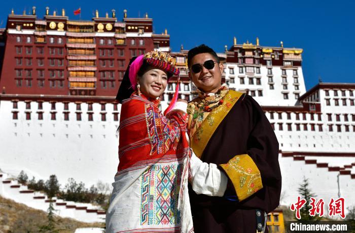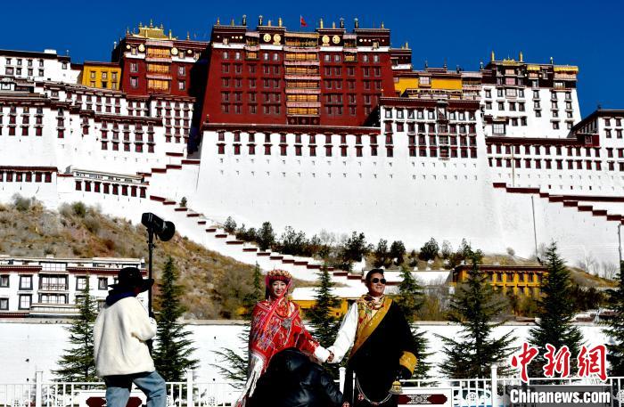 圖為12月3日,來自四川的勇忠阿旦(右一)和澤仁夏姆在布達(dá)拉宮廣場拍照留念。中新社記者 李林 攝
