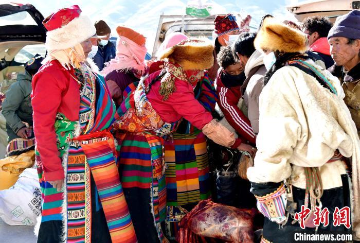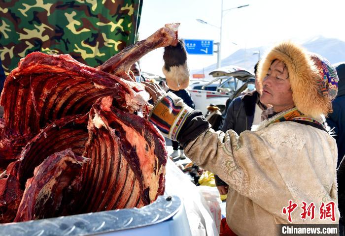 12月6日,西藏那曲市申扎縣第十八屆畜產(chǎn)品展銷會(huì)正式開(kāi)幕,40余家優(yōu)質(zhì)牧民合作社和企業(yè)帶著畜產(chǎn)品、手工藝品等當(dāng)?shù)靥厣a(chǎn)品參展,現(xiàn)場(chǎng)人頭攢動(dòng)、購(gòu)銷兩旺。圖為展銷會(huì)現(xiàn)場(chǎng),買賣雙方商談羊肉價(jià)格。中新社記者 李林 攝