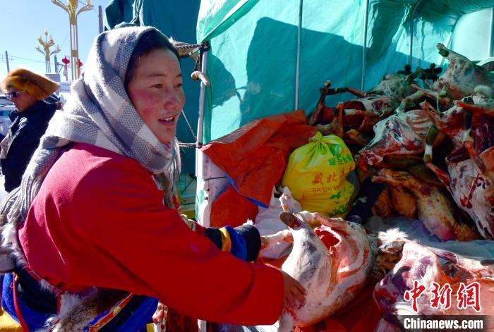 12月6日,西藏自治區(qū)那曲市申扎縣第十八屆畜產(chǎn)品展銷(xiāo)會(huì)現(xiàn)場(chǎng),民眾挑選羊肉。李林 攝
