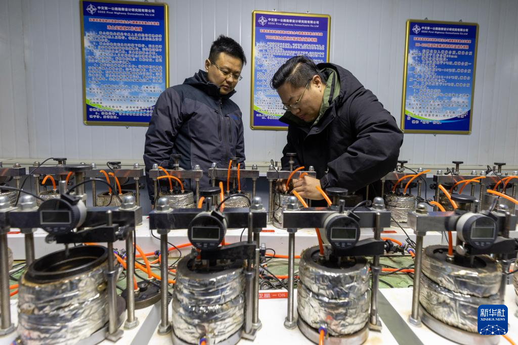 中交第一公路勘察設(shè)計(jì)研究院有限公司格爾木觀測(cè)研究基地主任陳冬根(左)與同事在實(shí)驗(yàn)室里檢查凍土樣品(12月3日攝)。新華社記者 姜帆 攝