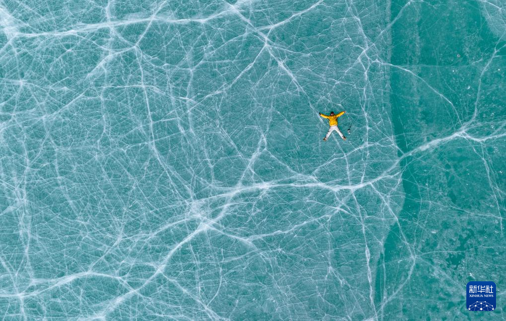 12月7日,一名游客躺在瓊穆崗嘎峰前的冰湖上拍照(無人機照片)。新華社記者 丁增尼達 攝