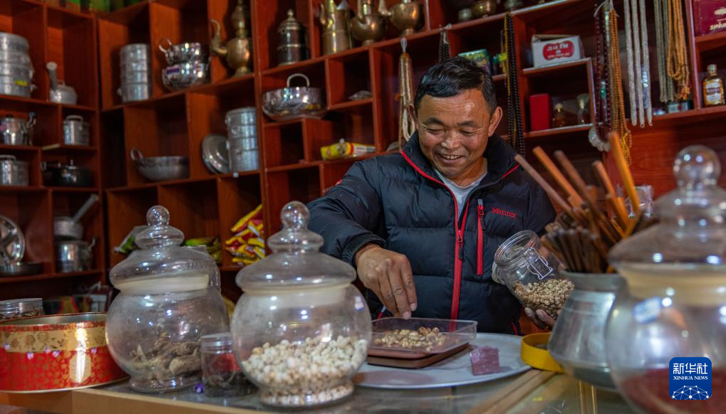12月13日,一名夏爾巴男子在自家的土特產(chǎn)店里稱(chēng)量貝母。