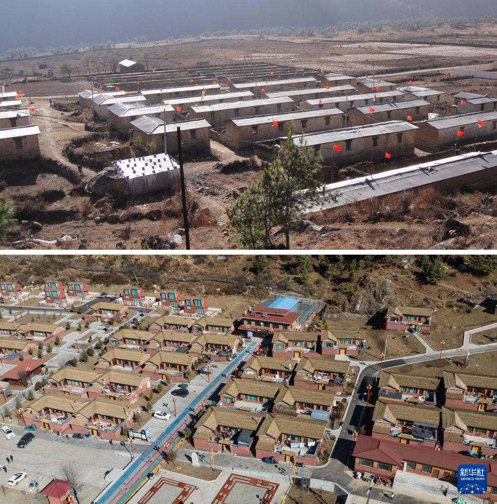 拼版照片,上圖為:2005年拍攝的達(dá)曼新村(新華社發(fā));下圖為:2024年12月15日拍攝的達(dá)曼新村(無(wú)人機(jī)照片,新華社記者丁增尼達(dá)攝)。新華社發(fā)
