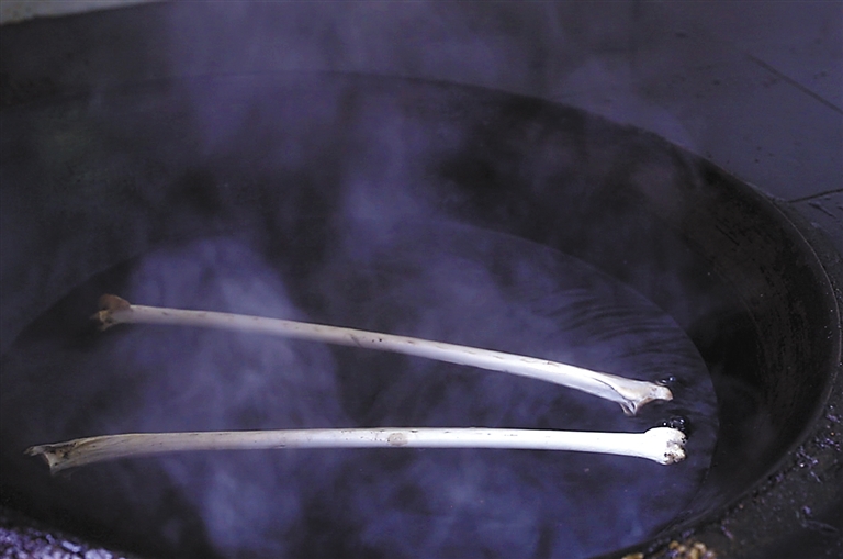 圖為高溫水煮鷹笛進(jìn)行殺菌消毒。