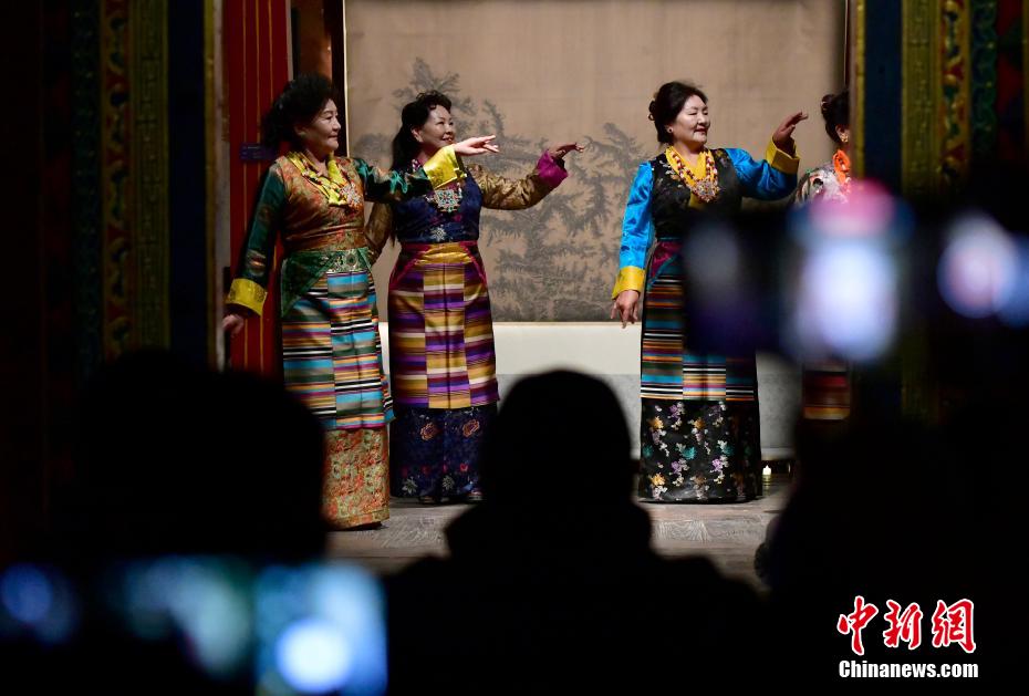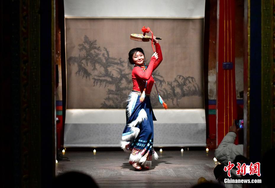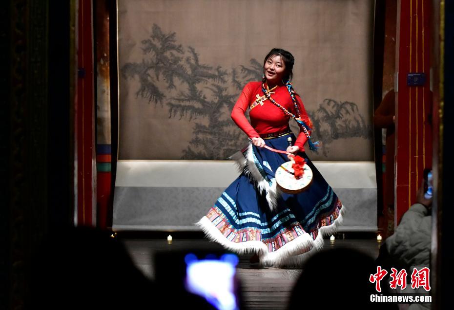 12月23日晚,西藏拉薩吉本崗藝術(shù)中心舉行吉光之夜活動。朗瑪堆諧、扎木念彈唱、熱巴舞等非遺展演,吸引眾多民眾共同領(lǐng)略西藏非物質(zhì)文化遺產(chǎn)的無窮魅力。圖為熱巴舞《太陽鼓舞》。中新社記者 李林 攝