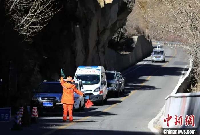 圖為護路期間,道班工人引導往來車輛。中新社記者 王磊 攝