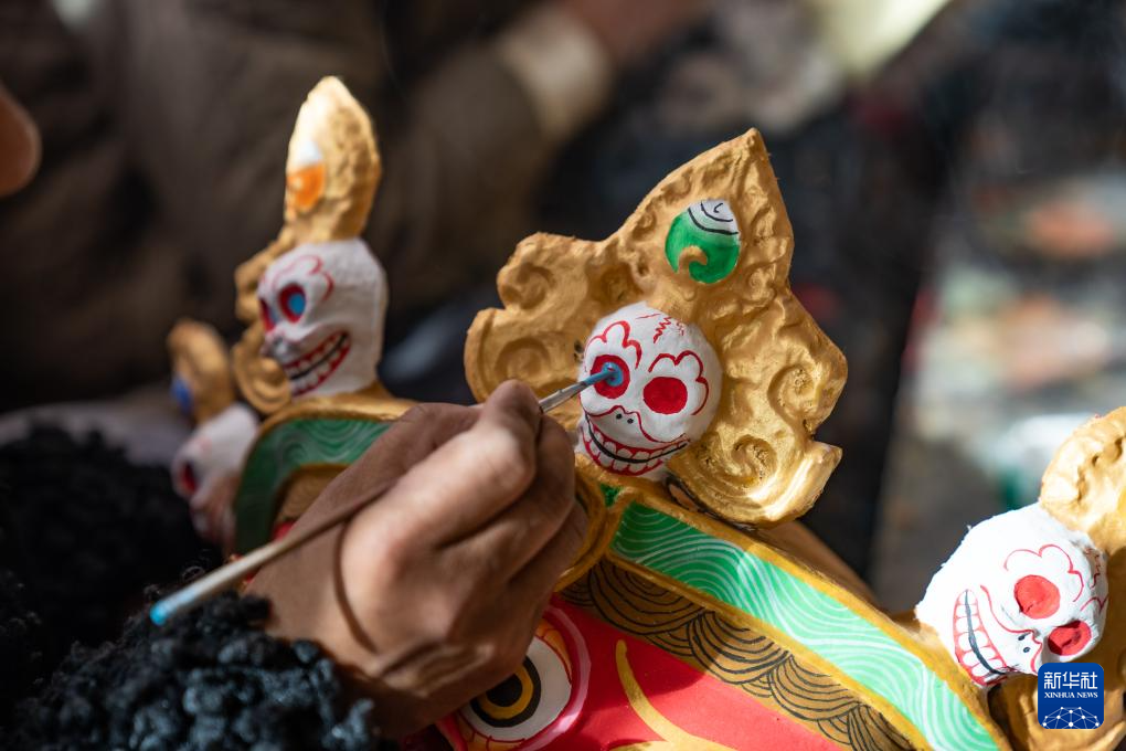 12月9日,拉薩達(dá)孜區(qū)雪鄉(xiāng)民間傳統(tǒng)手工藝農(nóng)民專業(yè)合作社的面具制作工匠制作傳統(tǒng)面具。新華社記者 丁增尼達(dá) 攝