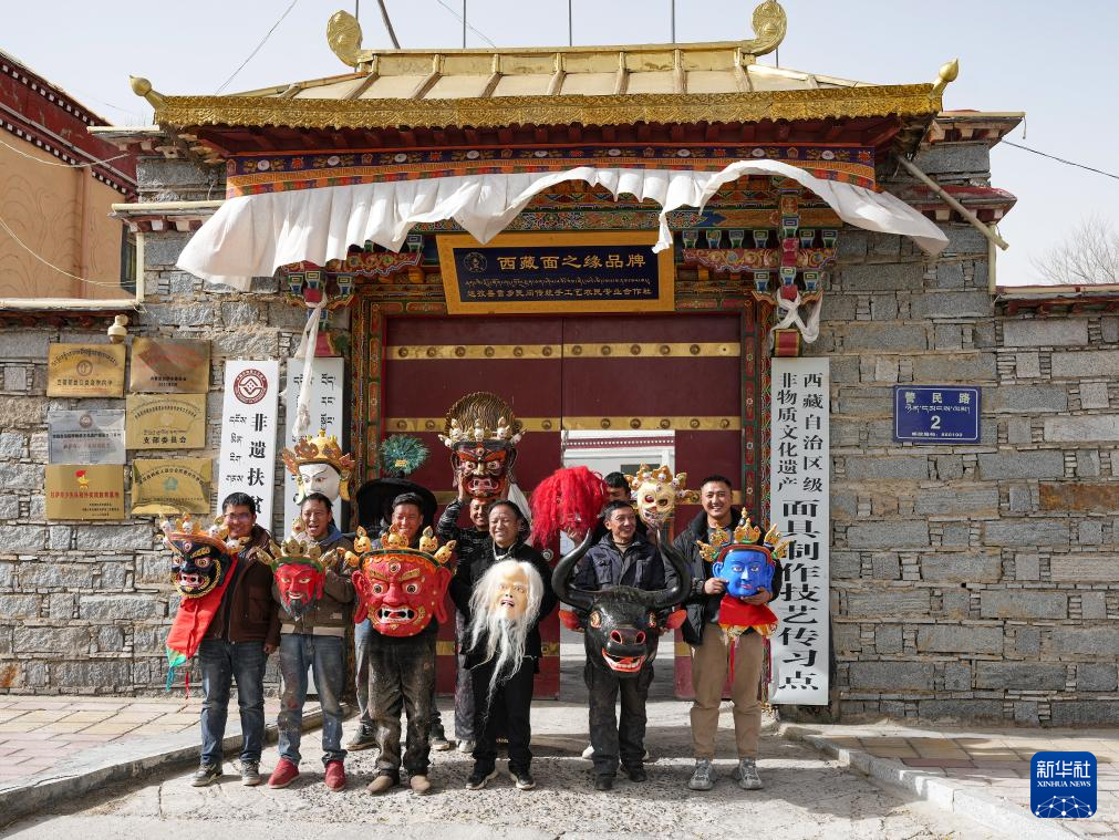 12月9日,拉薩達(dá)孜區(qū)雪鄉(xiāng)民間傳統(tǒng)手工藝農(nóng)民專業(yè)合作社的面具制作工匠們?cè)诤献魃玳T口合影。新華社記者 晉美多吉 攝
